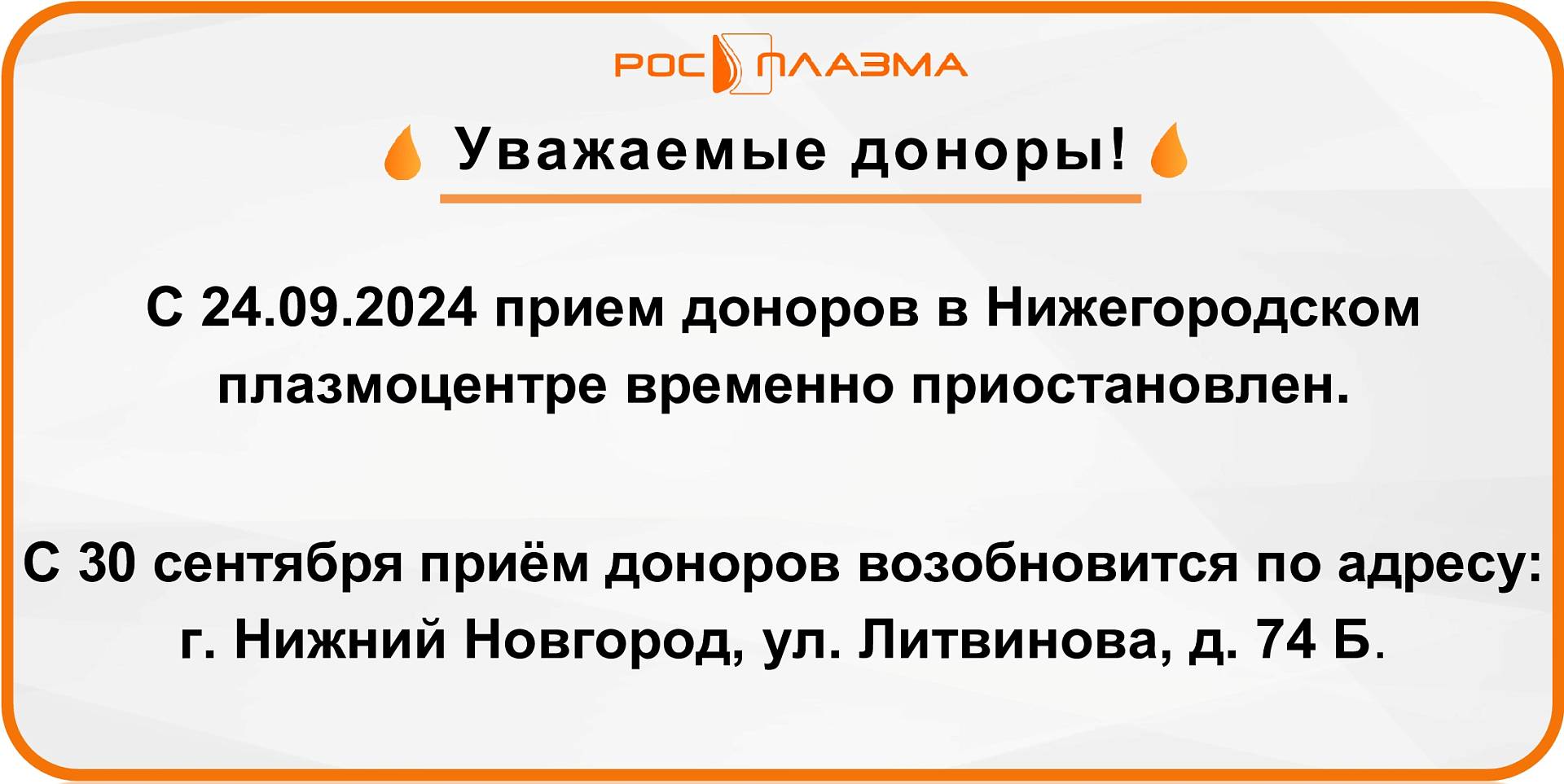 С 24.09.2024 прием доноров в Нижегородском плазмоцентре «Росплазма» ФМБА России временно приостановлен.