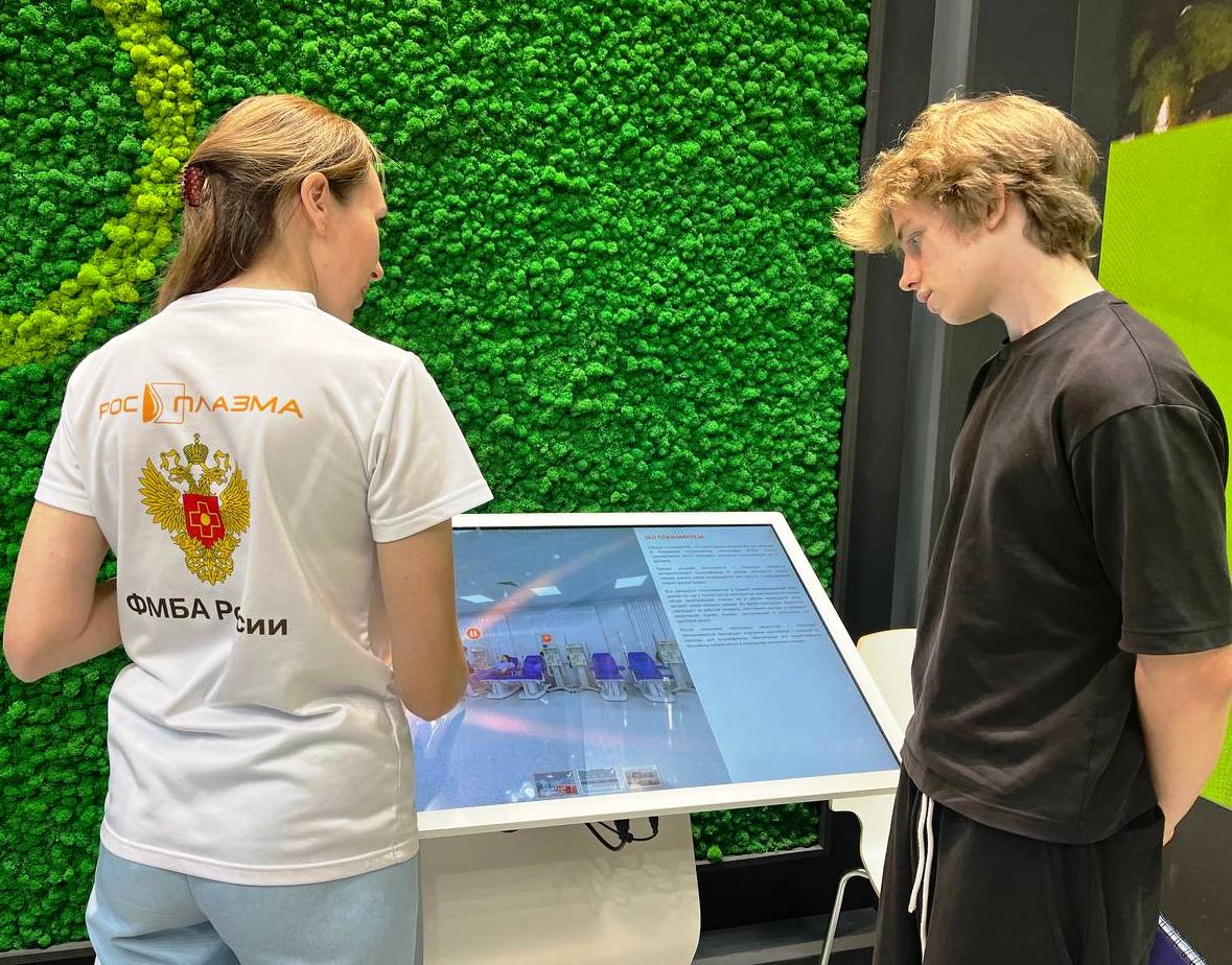 На стенде в нескольких форматах прошла презентация работы Кировского плазмоцентра «Росплазма» ФМБА России: виртуальные туры с использованием системы оборудования виртуальной реальности и интерактивной сенсорной панели, а также демонстрация на широком экране видеоролика о работе плазмоцентра и донорстве плазмы для производства лекарственных препаратов.