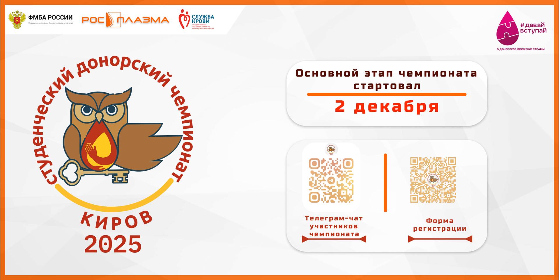 Студенческий донорский чемпионат проходит с 2 декабря по 15 апреля 2025 года на базе Кировского плазмоцентра «Росплазма» ФМБА России